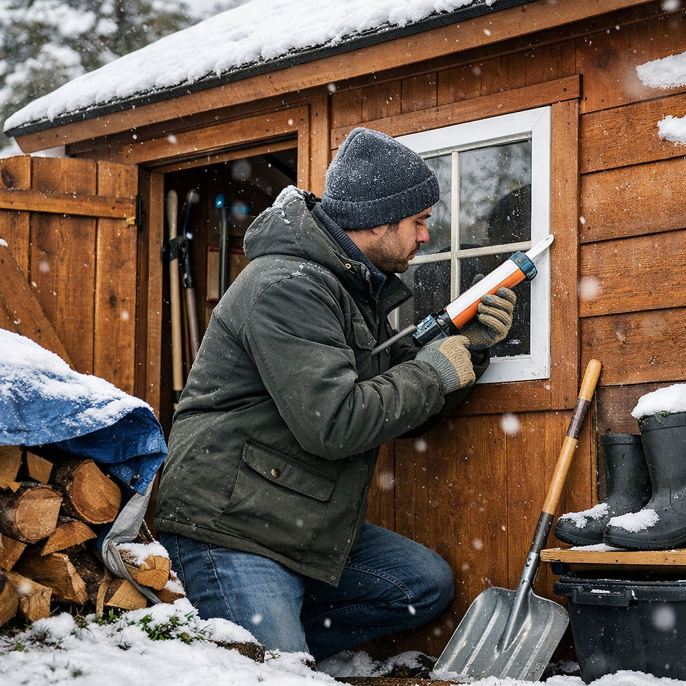 Tett igjen sprekker rundt dører og vinduer med tetningslister eller fugemasse for å holde regn og kald trekk ute. Hvis du har en trekonstruksjon, kan et ekstra lag impregnering eller maling beskytte mot råte og fukt.
